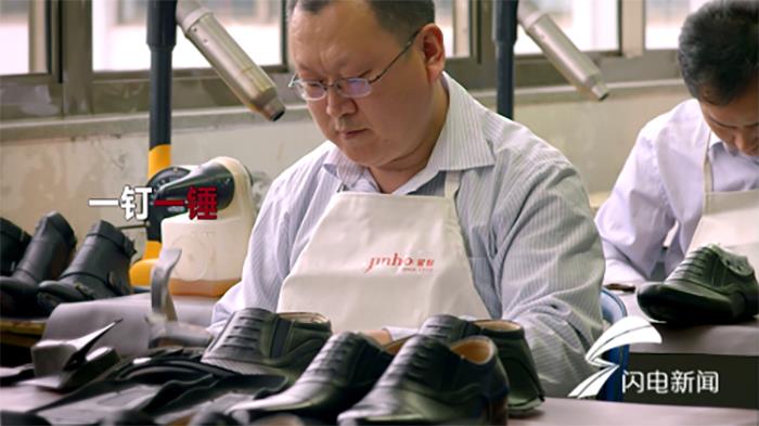 裁皮、片皮、壓襯、臥口、繃楦……生產車間內,數條生產線同時開工,幾十名手藝純熟的鞋匠雙手翻飛如行云流水,一釘一錘、一針一線間129道工序一絲不茍地完成。