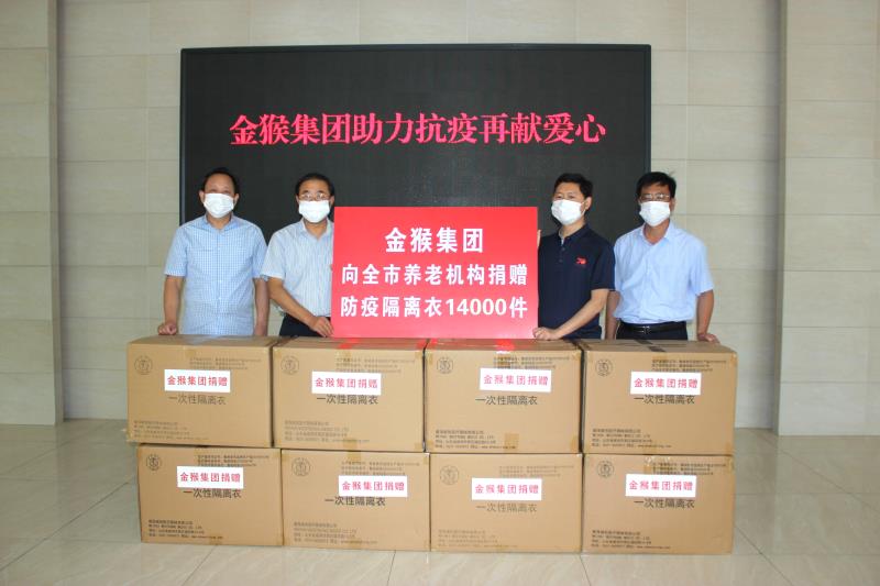 6月28日,金猴集團向威海市慈善總會捐贈14000件隔離衣,定向用于全市養老機構抗擊疫情,市民政局黨組書記、局長、市慈善總會常務副會長欒波從集團紀委書記、工會主席鄒曉伍手中接過《捐贈意向書》和隔離衣。