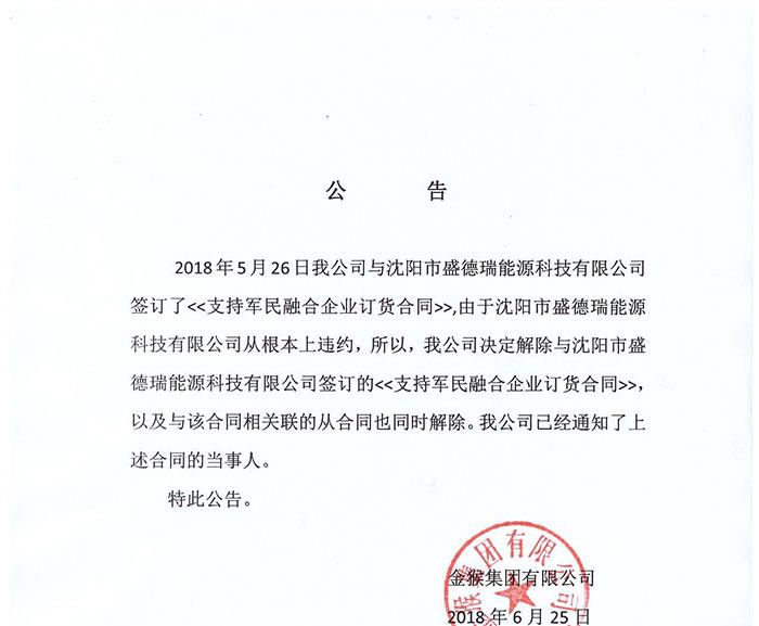金猴集團解除與沈陽市盛德瑞能源科技有限公司簽訂的合同